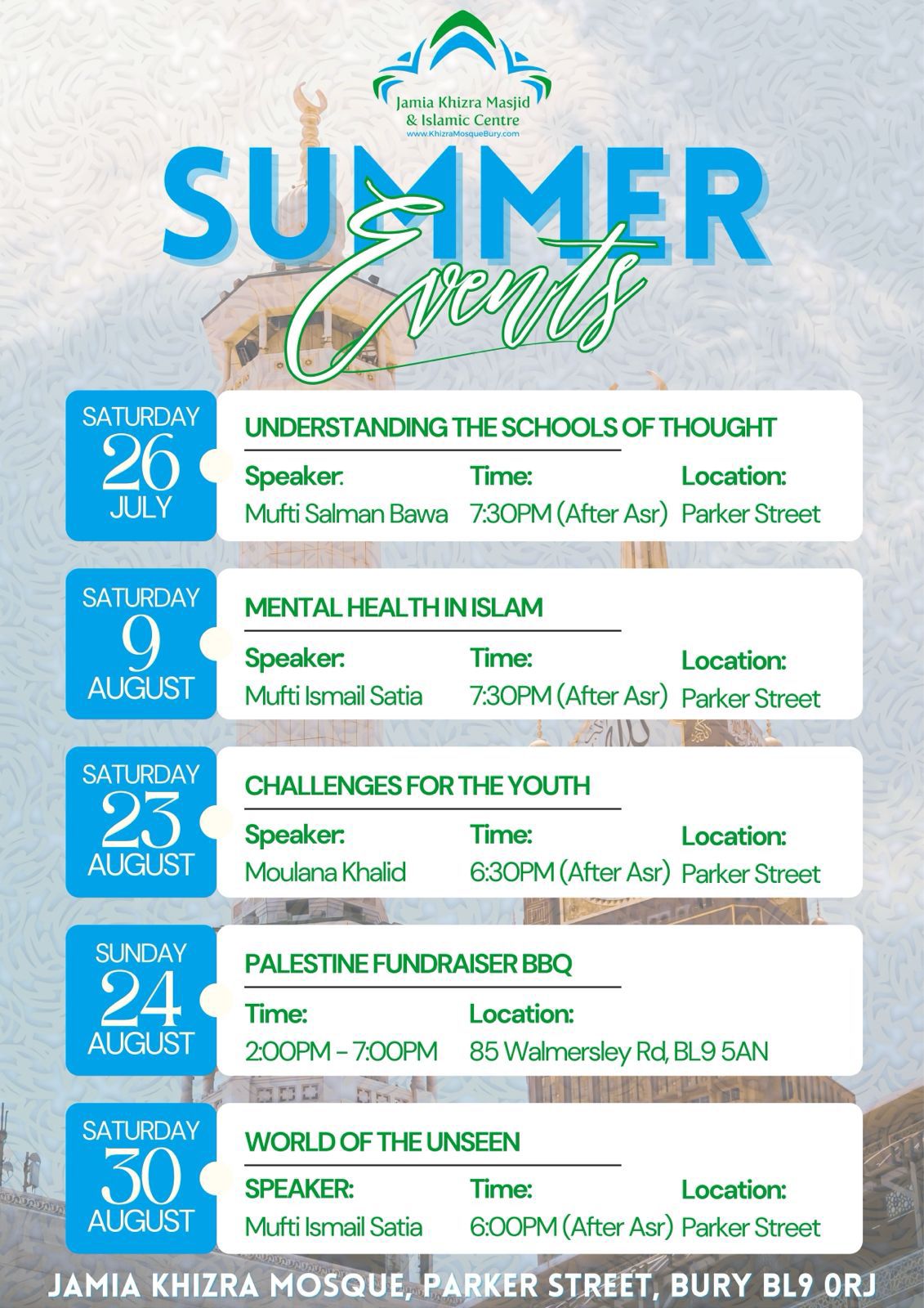 Join us this summer for a series of spiritually uplifting and beneficial gatherings aimed at nurturing the heart, mind, and soul. These events are open to all – brothers, sisters, youth, and families – and serve as an opportunity to reconnect with Islamic knowledge and community.